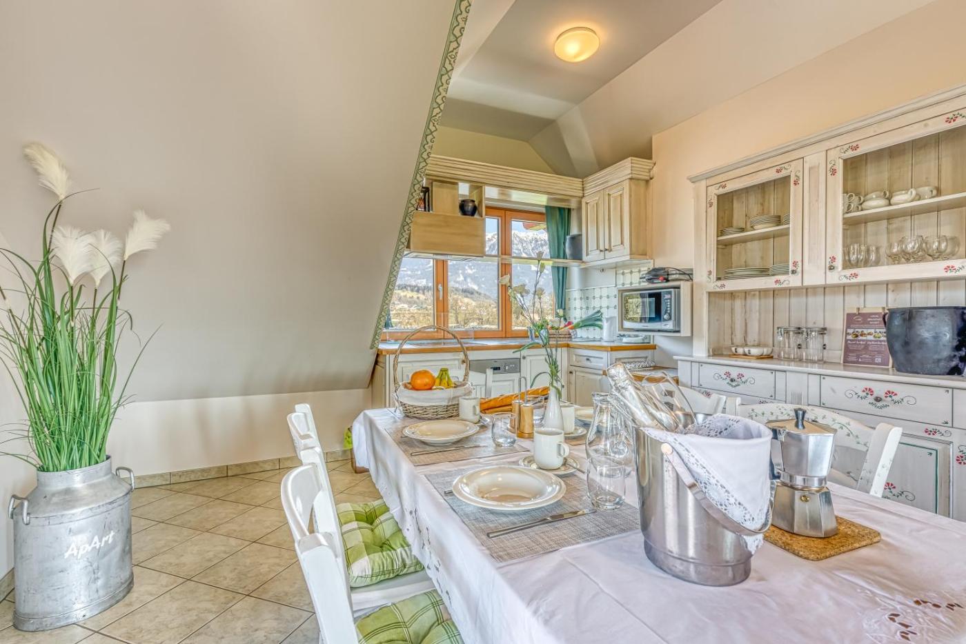 The apartment provides guests with a balcony, mountain views, a seating area, cable flat-screen TV, a fully equipped kitchen with a dishwasher and an oven, and a private bathroom with shower and a hair dryer. A microwave, a toaster and fridge are also featured, as well as a coffee machine and a kettle. At the apartment complex, the units are equipped with bed linen and towels.